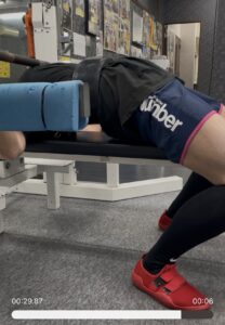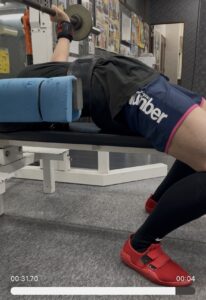 お尻が浮いているかも😳(パワーリフティングのルールでは、お尻がベンチシートから浮くと失敗試技になってしまいます。)動画を確認しながら、修正。